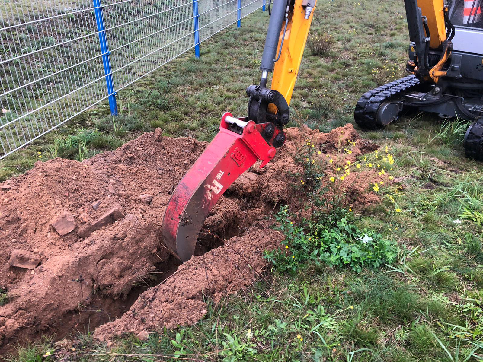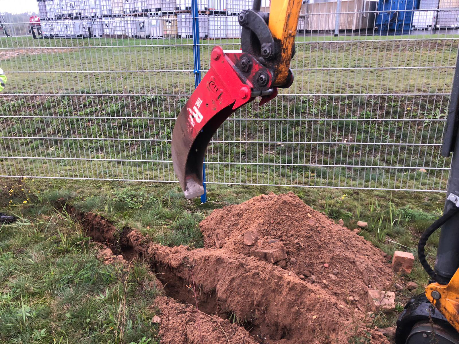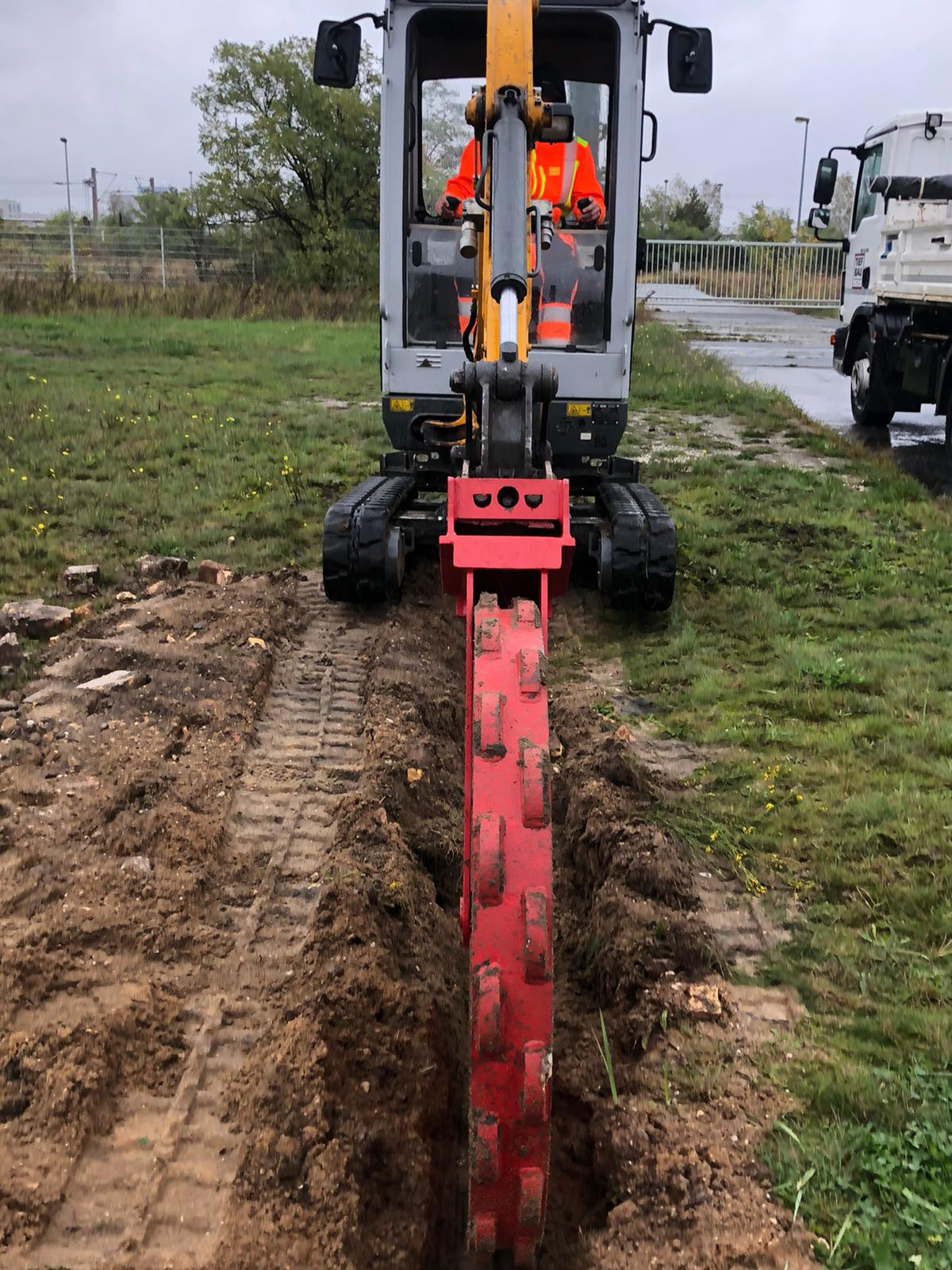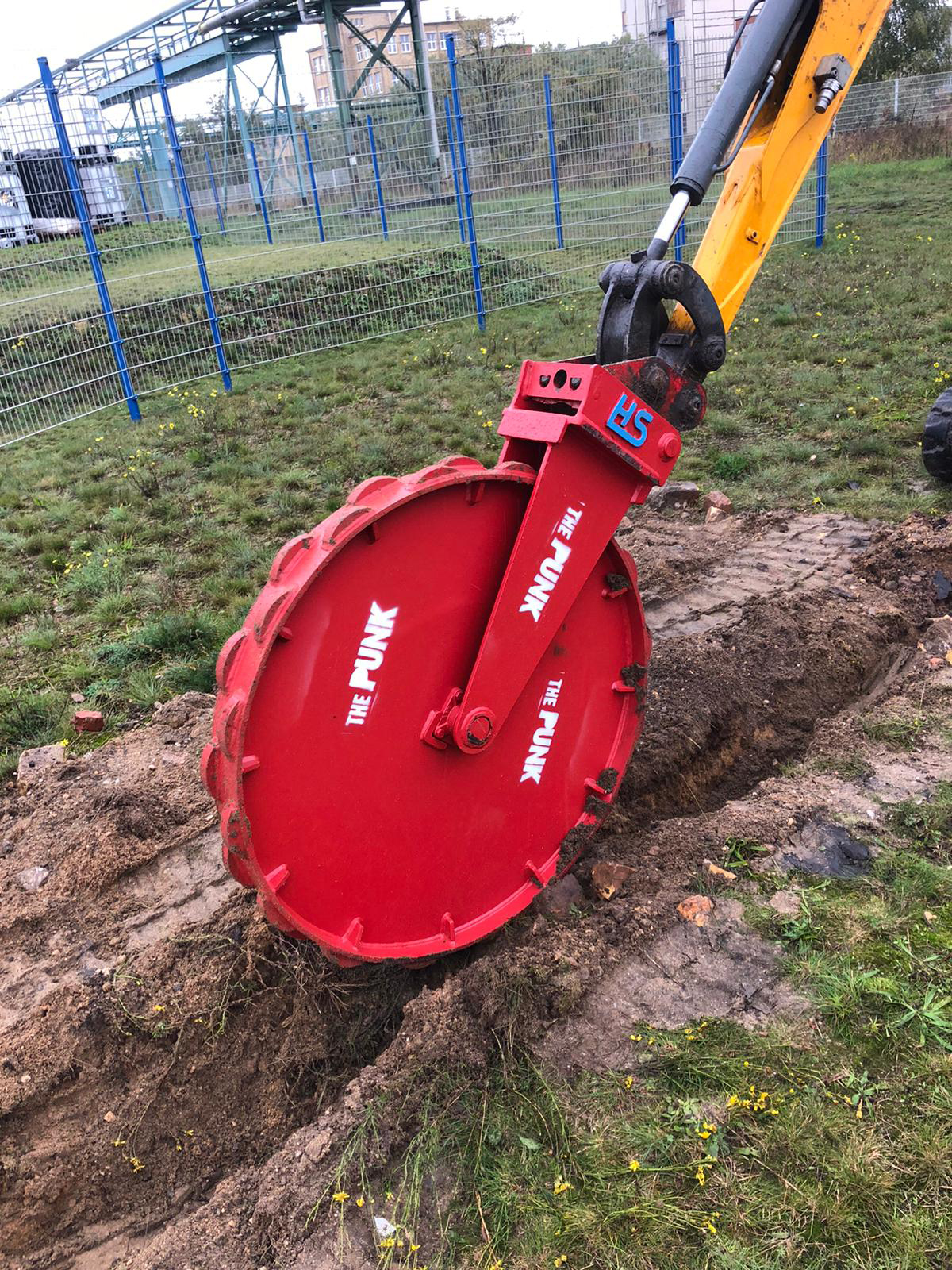 Nachdem der Graben ausgehoben wurde, kam das HS-Verdichterrad „THE PUNK“ zum Einsatz. Dieses drückt mit einer Walzbreite den Erdboden durch Löffelstilbewegung gleichmäßig fest. Aus Testzwecken wurde versucht die Anwalzung mit einer Verdichterplatte noch stärker zu verdichten – dies war allerdings nicht mehr notwendig.